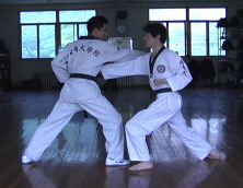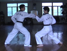 This process is common to every pattern of yaksok kyorugi of Taekwondo. It should be settled who is attacker and who is defender. In this photos, the right person is attacker and the left defender. The attacker moves first. He shifts from Junbi to Apkubi Arae Makgi. Here, the attacker should follow the ways of Samjae. It means he should not draw back, but drop his hip down bending his knee. And the attacker yells with his motion. It signs that he is ready for atttack. Then, the defender get ready for defence. It means he thinks how he will move. He then yells, which signs he is ready for defence. Refer to "Understanding the attacker's motion". |