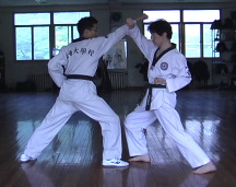 This process is common to every pattern of yaksok kyorugi of Taekwondo. It should be settled who is attacker and who is defender. In this photos, the right person is attacker and the left defender. The attacker moves first. He shifts from Junbi to Apkubi Arae Makgi. Here, the attacker should follow the ways of Samjae. It means he should not draw back, but drop his hip down bending his knee. And the attacker yells with his motion. It signs that he is ready for atttack. Then, the defender get ready for defence. It means he thinks how he will move. He then yells, which signs he is ready for defence. Refer to "Understanding the attacker's motion". |