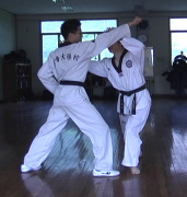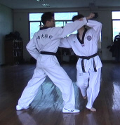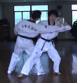 This process is common to every pattern of yaksok kyorugi of Taekwondo. It should be settled who is attacker and who is defender. In this photos, the right person is attacker and the left defender. The attacker moves first. He shifts from Junbi to Apkubi Arae Makgi. Here, the attacker should follow the ways of Samjae. It means he should not draw back, but drop his hip down bending his knee. And the attacker yells with his motion. It signs that he is ready for atttack. Then, the defender get ready for defence. It means he thinks how he will move. He then yells, which signs he is ready for defence. Refer to "Understanding the attacker's motion". |