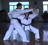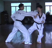Pattern 10 is the following. The attacker shifts from Arae Makgi to Apkubi momtong jireugi with one step forward. Then the defender drops down to left Dutkubi seogi, and block the punch with his right elbow. And then step forward to make a Juchum Seogi and hit the attacker's trunk with his right elbow. The simplest pattern, but not easy for beginners. Techical point here is that you should make exact pose of Duitkubi seogi, and know the key points of elbow technique. |