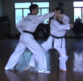 This process is common to every pattern of yaksok kyorugi of Taekwondo. It should be settled who is attacker and who is defender. In this photos, the right person is attacker and the left defender. The attacker moves first. He shifts from Junbi to Apkubi Arae Makgi. Here, the attacker should follow the ways of Samjae. It means he should not draw back, but drop his hip down bending his knee. And the attacker yells with his motion. It signs that he is ready for atttack. Then, the defender get ready for defence. It means he thinks how he will move. He then yells, which signs he is ready for defence. Refer to "Understanding the attacker's motion". |