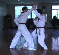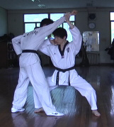 This process is common to every pattern of yaksok kyorugi of Taekwondo. It should be settled who is attacker and who is defender. In this photos, the right person is attacker and the left defender. The attacker moves first. He shifts from Junbi to Apkubi Arae Makgi. Here, the attacker should follow the ways of Samjae. It means he should not draw back, but drop his hip down bending his knee. And the attacker yells with his motion. It signs that he is ready for atttack. Then, the defender get ready for defence. It means he thinks how he will move. He then yells, which signs he is ready for defence. Refer to "Understanding the attacker's motion". |